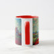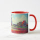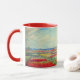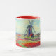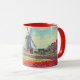 Mug à café avec la peinture de la fleur et du moulin de Claude Monet. De beaux champs colorés de tulipes rouges, roses et jaunes à côté d'un moulin à vent et d'une maison en Hollande. Un grand cadeau Monet pour les amateurs d'impressionnisme et d'art français.