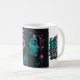 Composición más expresiva y abstracta: rostro femenino con contrastes bicolor, trazos fluidos, manchas y líneas que generan movimiento y profundidad. La flor central actúa como sello botánico de la colección, manteniendo la estética neon teal & pink para una línea uniforme en cojines, sudaderas y pósters.