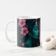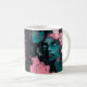 Composición más expresiva y abstracta: rostro femenino con contrastes bicolor, trazos fluidos, manchas y líneas que generan movimiento y profundidad. La flor central actúa como sello botánico de la colección, manteniendo la estética neon teal & pink para una línea uniforme en cojines, sudaderas y pósters.