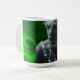 Tasse artistique avec portrait de femme en nuances de gris entouré d'une lumière émeraude verte éclatante, symbolisant la vitalité, le mystère et le renouveau créatif