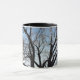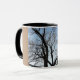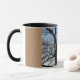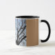 Une Mug avec une photo d'un arbre et du ciel dessus et fond Brown.