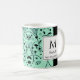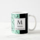 Tasse à café moderne et élégante avec monogramme, un cadeau idéal pour les demoiselles d'honneur, la fête des mères, les anniversaires, Noël et tout au long de l'année. Le design présente un motif floral noir sur un fond vert menthe néo avec un panneau noir. Au centre, il y a un grand monogramme et un nom fictif, avec un texte fictif en dessous qui dit "Précieux pour Dieu", qui sont tous personnalisables, il suffit donc d'ajouter votre nom et votre texte selon les besoins, par exemple "Merci". Convient à toute occasion ou à tout usage. Articles assortis disponibles, vous pouvez donc créer de beaux ensembles de cadeaux pour les mariages, Noël, les anniversaires, la fête des mères, etc.