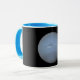 NEPTUNE. (Montré en couleur réelle) Sombre, froid et fouetté par des vents supersoniques, le géant de glace Neptune est la huitième et la plus lointaine planète de notre système solaire. Avec un rayon de 15 299,4 miles (24 622 kilomètres), Neptune est environ quatre fois plus large que la Terre. Si la Terre avait la taille d'un nickel, Neptune serait à peu près aussi grande qu'un baseball. Neptune a au moins cinq anneaux principaux et quatre arcs d'anneau proéminents que nous connaissons jusqu'à présent. D'une distance moyenne de 4,5 milliards de kilomètres, Neptune est à 30 unités astronomiques du Soleil. Une unité astronomique (abrégée AU), est la distance du Soleil à la Terre. De cette distance, il faut 4 heures de soleil pour se rendre du Soleil à Neptune. Un jour sur Neptune prend environ 16 heures (le temps nécessaire à Neptune pour tourner ou tourner une fois). Et Neptune fait une orbite complète autour du Soleil (une année en temps népalais) dans environ 165 années terrestres (60 190 Jours des terres). Neptune a 14 lunes connues. La plus grande lune de Neptune est Triton. Triton est la seule grande lune du système solaire qui entoure sa planète dans une direction opposée à la rotation de la planète (une orbite rétrograde), ce qui suggère qu'elle pourrait avoir été un objet indépendant capturé par Neptune. Triton est extrêmement froid, avec des températures de surface autour de moins 391 degrés Fahrenheit (moins 235 degrés Celsius). Et pourtant, malgré ce gel profond à Triton, Voyager 2 a découvert des geysers crachant du matériel glacé à plus de 5 miles (8 kilomètres). L'atmosphère mince de Triton, également découverte par Voyager, a été détectée de la Terre plusieurs fois depuis, et se réchauffe, mais les scientifiques ne savent pas encore pourquoi.