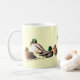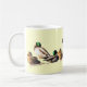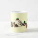 Neuf canards colverts décorent cette jolie tasse. Les mâles ont des têtes vertes irisées, principalement des corps blancs et des becs jaunes. Les plumes de la femelle sont dans les tons brun et or avec des becs orange. Placé sur un arrière - plan crémeux avec une bordure verte qui correspond au plumage masculin, c'est un design frappant!