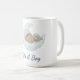 New mom to be baby shower Coffee Mug This design features a delicate watercolor illustration of a baby boy resting on a soft, fluffy cloud, framed by a lush arrangement of midnight blue and champagne gold roses.