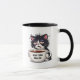 With messy fur, tired eyes pointing in different directions, and a playful expression, the cat holds an oversized coffee