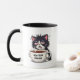 With messy fur, tired eyes pointing in different directions, and a playful expression, the cat holds an oversized coffee