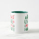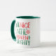 "Sympa jusqu'à ce que Proven Naughty" dit le texte rouge et vert sur cette tasse. Le texte en mauvais état est accompagné de pins verts et de flocons de neige rouges. L'image est imprimée deux fois sur la tasse.