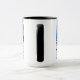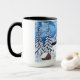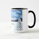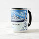 Un mug avec une belle scène hivernale comprenant des montagnes enneigées, une cabane rustique et des conifères couverts de neige. Œuvre originale de W.B.