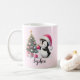 Cette tasse de Noël personnalisée unique présente un mignon manchot qui orne un arbre de Noël festif avec des ornements roses. L'adorable pingouin dans un chapeau de Père Noël rose et le nom modèle dans une police de script rendent facile de créer de jolies boissons pour les enfants pour la saison des fêtes. C'est un beau cadeau de vacances pour les amateurs de pingouins, les enfants ou toute personne qui aime les tasses à café festives.