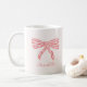 Tasse rose blush girly avec illustration de nœud rayé et nom en script. Articles assortis disponibles. Œuvre originale issue des illustrations de l'artiste. Veuillez utiliser le bouton 'm'envoyer un message ci-dessous pour obtenir de l'aide pour une personnalisation supplémentaire et des demandes spéciales. © Zoe Chapman Design