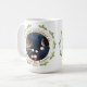 Notre premier Noël en tant que Mme. & Mr Script Mariage Photo Mug. Design de vacances moderne pour les jeunes mariés avec une photo dans le cadre circulaire, branches de pin et texte dans un script doré moderne Notre premier Noël en tant que Mme. & M. devis et année mariage. Insérez votre photo dans le modèle et personnalisez les noms et l'année.