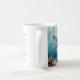 A oceanic themed coffee cup with a beautiful illustration of an impasto style whale swimming deep in the sea by vibrant colorful coral. A really beautiful coastal art. Colors used are teal, blue and soft coastal colors. On the back is a sweet coastal poem wishing someone a calm day.