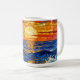A coffee cup with an illustration of a stained glass mosaic ocean waves and sunset illustration.