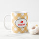 Les tasses à café personnalisées font des cadeaux pratiques à vos serveuses d'accueil. Cette tasse à boisson personnalisée est munie d'un arrière - plan motif en vichy dont le nom ou le texte sont personnalisés dans un cadre ovale perlé. Le nom est bien sûr recouvert de cerises. Merci à votre fête de mariée avec ces tasses à café chic.