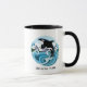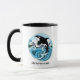 Un orque sautant de l'océan avec de l'eau tout autour. Montagnes et ciel bleu tout autour de l'orque, le tout dessiné dans un style tatouage Art nouveau.