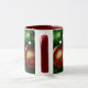Image d'ornements de Noël rouge fantaisie ornés d'or artistique et de défilement de parties scintillant vertes, suspendus sur un ruban vert devant un abstrait arrière - plan de verdure et de lumières de Noël. Faites de votre tasse matinale une tasse joyeuse !