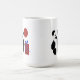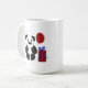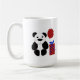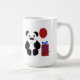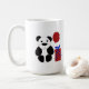 Une mignonne tasse de célébration avec un ours en panda tenant un ballon rouge avec un emballage rouge à côté de lui.