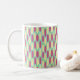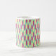 Cette tasse a une conception géométrique de fait d'un arrière - plan de rectangles vert-mer et bleu clair avec des ovales jaunes et roses sur le dessus.