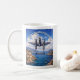 This vivid artwork showcases the P-38 Lightning flying over the Mediterranean Theater of World War II, framed by sunlit coastal cliffs, historic seaside villages, and deep blue waters below. Viewed from above, the P-38 twin-boom fighter dominated the sky as it patrolled strategic maritime routes once vital to Allied operations across Southern Europe and North Africa. The Mediterranean backdrop highlights the P-38’s long-range capabilities and distinctive design, symbolizing American air power during critical WWII campaigns. Perfect mug for aviation enthusiasts, WWII history buffs, military collectors, and warbird fans, especially of the P-38 Lightning! Available in other styles (including handle color and interior color) and sizes