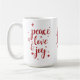 Profitez de cette tasse de vacances avec les mots paix amour et joie en typographie script et renne rouge au milieu.