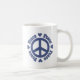 Tasse de paix avec signe de paix et coeurs bleu passé. Texte coordonné couleur personnalisable à l'envers, n'oubliez pas de modifier ! Choix de mug en céramique ou de mug de voyage.