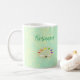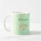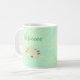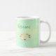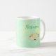 Montrez votre côté artistique avec cette tasse de café artistique et personnalisée. Un graphique de palette d'art avec plusieurs peintures colorées apparaît sur un arrière - plan vert mer avec des taches jaune pâle. Les mouchettes ressemblent à un tableau d'éponge ou d'éclaboussure. Au-dessus de la palette, votre nom apparaît dans un script décontracté amusant. Cette conception apparaît de part et d'autre de la tasse. Laissez cette tasse colorée montrer votre personnalité créative et artistique.