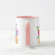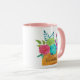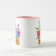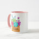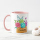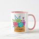 Un bel arrangement floral rose bleu violet vert de fleurs dans un panier sur cette tasse de café. Personnalisez-le avec votre nom. Ça lui fait un grand cadeau. Vient dans beaucoup d'autres couleurs et aussi uni sans couleurs. Deux tailles, 11 oz et 15 oz.