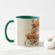 Cette tasse à café de vacances personnalisée présente un thème Thanksgiving illustré. Un panneau en bois est représenté au centre avec un message "Bon thanksgiving" imprimé en haut dans une police de caractères élégante. Un exemple de nom de famille est imprimé ci-dessous pour que vous puissiez le personnaliser afin d'inclure votre propre nom ou texte personnalisé. La scène de l'automne est très soignée, avec une bicyclette fantaisiste à gauche et un épouvantail à droite. Un petit écureuil est assis aux pieds du épouvantail. Les feuilles d'automne mettent l'accent sur l'illustration.