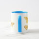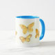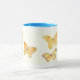 Une tasse blanche avec une jante et une poignée bleues et un délicat dessin peint de papillons orange.