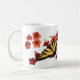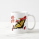Cette magnifique tasse de photographie d'art met en scène des papillons à queue de tigre jaune et noir sur des fleurs de Calibrachoa rouge et rose.