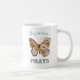 Un beau papillon aux fleurs aux couleurs rétro d'orange, rose, turquoise et marron avec les mots "cette maman prie". Une mignonne tasse pour la mère chrétienne.