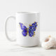 Bijoux, bleu, saphir, papillon aux fleurs pétillantes avec aile décorée de bleu, fleurs précieuses avec feuilles d'or sur arrière - plan blanc.