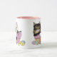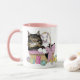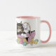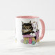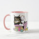 Cute chaton à poils longs tabby assis dans un panier de Pâques avec un arc rose et un lapin de Pâques farci. Oeufs de Pâques tout autour du panier.