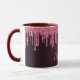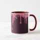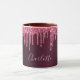 Une tasse élégante, girly et glamour. Faux parties scintillant couleur cerisier rose foncé gouttes. Arrière - plan profond et foncé de dégradé bordeaux. Personnalisez et ajoutez un nom. Le nom est écrit avec un script de style moderne écrit à la main. Lettres de couleur rose pâle.