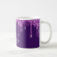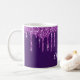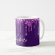 Une tasse monogrammée fillette et tendance. Un arrière - plan chic et violet décoré avec des gouttes de parties scintillant, la peinture goutte à goutte. Personnalisez et ajoutez un nom et des initiales monographiques. Lettres violettes et blanches. Le nom est écrit avec un script de style moderne écrit à la main.