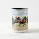 Fabuleuse finition photo d'un grand champ de pur-sang qui court sur la ligne d'arrivée peu après la rupture de la porte de départ. Jockeys implorant leurs chevaux pour prendre position avant de se diriger vers le premier virage. Tous les chevaux se trouvent à une distance de l'autre en descendant le tronçon en ce jour historique. Sous un magnifique ciel bleu nuageux, les soies des cavaliers brillent sous le soleil de septembre. Le gagnant final est allé à Harangue (7) avec le jockey Angel arroyo Jr.Fleetphoto