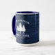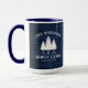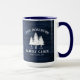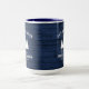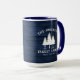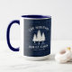 Une belle et élégante tasse à café à thème rustique, avec votre nom et "Cabine de famille", Ranch, Cottage ou autre texte avec sa date et son emplacement établis si désiré. Ce design personnalisé et unique présente un texte rustique de style campagnard avec une silhouette blanche de pins sur un imprimé de planches de bois aux couleurs bleues riches. Pour voir d'autres modèles comme celui-ci, n'hésitez pas à visiter ma boutique ici à "Zazzle.com/Rustic_Charm". Merci .