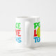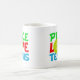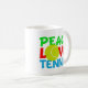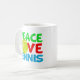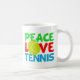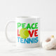 J'adore jouer au tennis. Un joli cadeau de tasse de joueur de tennis avec un ballon de tennis jaune comme le O in Love. Peace and Tennis écrit en bleu et vert.