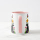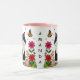 A sweet personalized coffee cup with a cute illustration of a black and white cat surrounded by flowers and butterflies in a paper quilling impasto style.