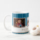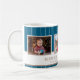 Personalized Family 3 Photo Collage Christmas Mug. Merry Christmas and a custom text. Add three photos. Personalize the text any way you wish or delete it. The background features a blue green background with white stripes. Great as a Christmas gift or a keepsake mug for yourself.
