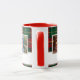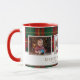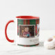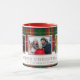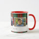 Personalized Family 3 Photo Collage Tartan Plaid Pattern Christmas Mug. Merry Christmas and a custom text. Add three photos. Personalize the text any way you wish or delete it. The background features a red and green plaid pattern. Great as a Christmas gift or a keepsake mug for the family.
