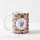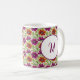 This ceramic mug features a vibrant botanical pattern that combines rich magenta and warm orange floral motifs, designed to bring a touch of nature into any daily routine. The intricate garden-inspired design reflects a curated approach to home decor, offering a sophisticated look that complements a variety of interior styles. A central circular frame allows for a subtle monogram, providing an opportunity to tailor the item to personal preferences or to create a unique gift.