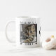 Profitez de cette tasse personnalisée amusante avec deux photos de votre chat, le ou les nom(s) du chat entre empreintes de pattes et un grand empreinte de patte du centre. Personnalisez-le avec les photos de votre chaton dans les cadres noirs et le ou les noms entre les empreintes de pattes.