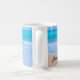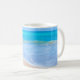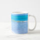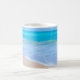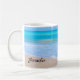 Une tasse personnalisée avec la photo d'une scène océanique bleu clair avec des vagues douces le long d'un bord de mer et du sable brun doux. Un ciel bleu avec des nuages moelleux au loin. Un paysage marin tropical idyllique.