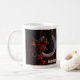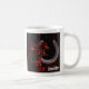 Un mug avec une photo représentant un fer à cheval suspendu orné d'un ruban à carreaux de bison et de décorations de Noël.