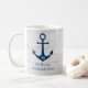 Savourez votre café dans cet ensemble sur le thème nautique doté d'une ancre bleu marine. Le design a un arrière - plan patiné en bois blanc. Mug peut être personnalisé avec un monogramme et un nom ou une phrase d'un côté, et une grande photo de l'autre côté.