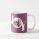 Cette Mug photo de Noël moderne est décorée avec le mot JOY en blanc sur un arrière - plan de prune violette. Facilement personnalisable avec votre photo et votre nom.