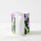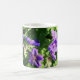 Une jolie tasse blanche avec une image photographique de géraniums bleus tout autour.