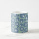 Cette tasse a un design moderne du milieu du siècle de cercles bleus poussiéreux avec des éclats blancs à l'intérieur sur un champ de vert de mer.